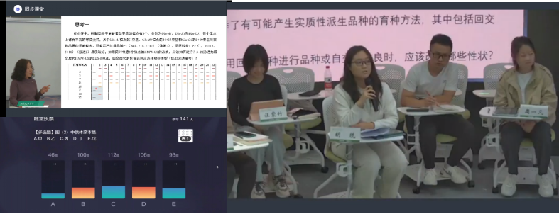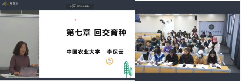 来自中国农业大学“作物育种学”课程负责人李保云教授讲解了“作物育种学”第6章回交育种的课程内容,她从回交育种的意义、回交后代选择、分子标记在回交后代选择中的作用以及如何加速回交育种进程四个方面进行解析。李老师的讲解深入浅出,将回交育种中的理论与实践相结合,引人入胜,不仅注重讲解,更注重与线上线下的互动,精心设计了多个互动问答,通过分组讨论和线上投票的方式,使学生们能够充分融入课堂,形成师生间有效的交流。