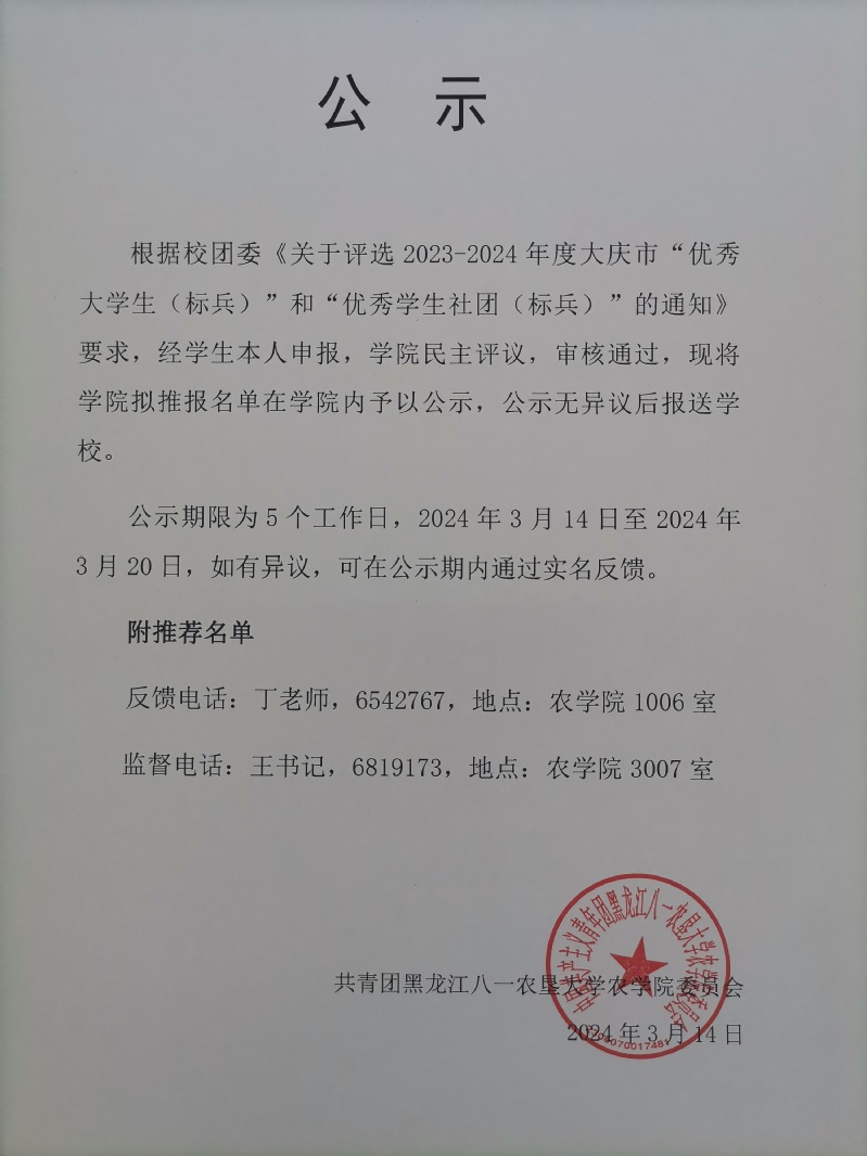 公示 | 3044am永利集团欢迎您《关于评选2023-2024年度大庆市“优秀大学生(标兵)”和优秀学生社团(标兵)“的通知