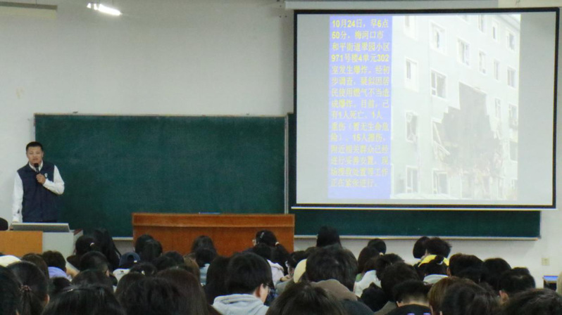 宋教官用最近全国重大火灾事故经典案例,一场场不忍直视的悲剧,一幅幅触目惊心的画面,让师生们深刻意识到消防工作与防范火灾的重要性。宋教官还从消防宣讲的目的、火灾事故及危害、引起火灾的各种原因、应对各种火灾的方法、消防应急包的配备进行了深入细致的讲解,特别强调,发生火灾第一时间要么及时扑灭(具有一定的专业消防知识),要么第一时间远离,切勿逗留,拿生命当儿戏。