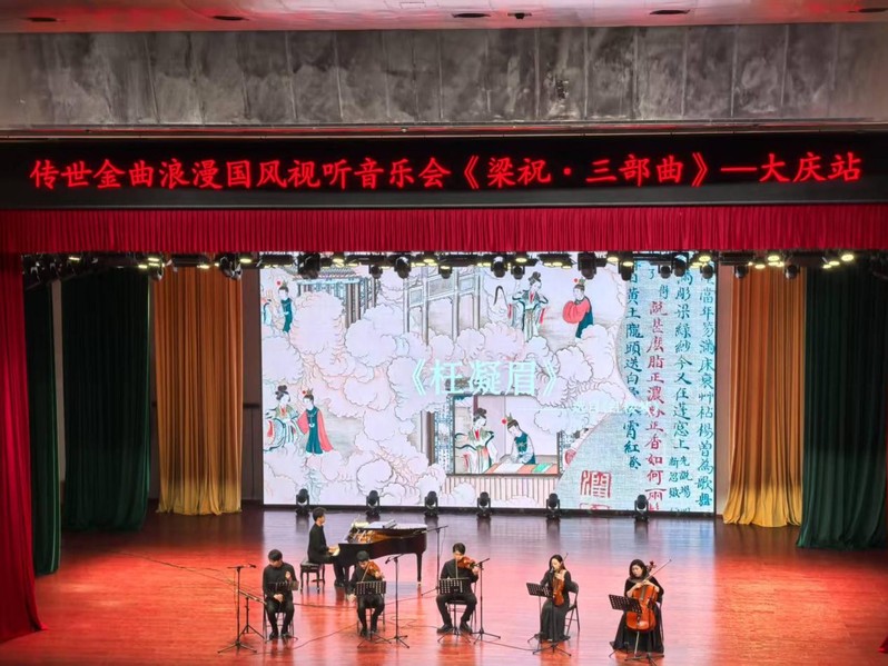 音乐会以经典爱情故事《梁山伯与祝英台》为主题,通过《梁祝》的经典旋律串联起十多首国风经典音乐作品,如《左手指月》《踏山河》等。演奏家们将二胡、古筝、琵琶等传统乐器与现代音乐完美结合,呈现了一场充满浪漫与诗意的音乐盛宴。舞台上的大屏幕同步播放与音乐主题相关的画面,增强了观众的沉浸感,让音乐与视觉艺术相得益彰。