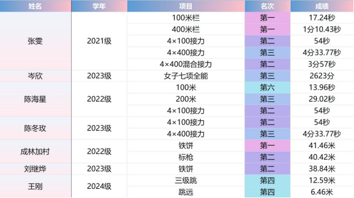 在田径多个项目中斩获金牌、银牌等多项殊荣,