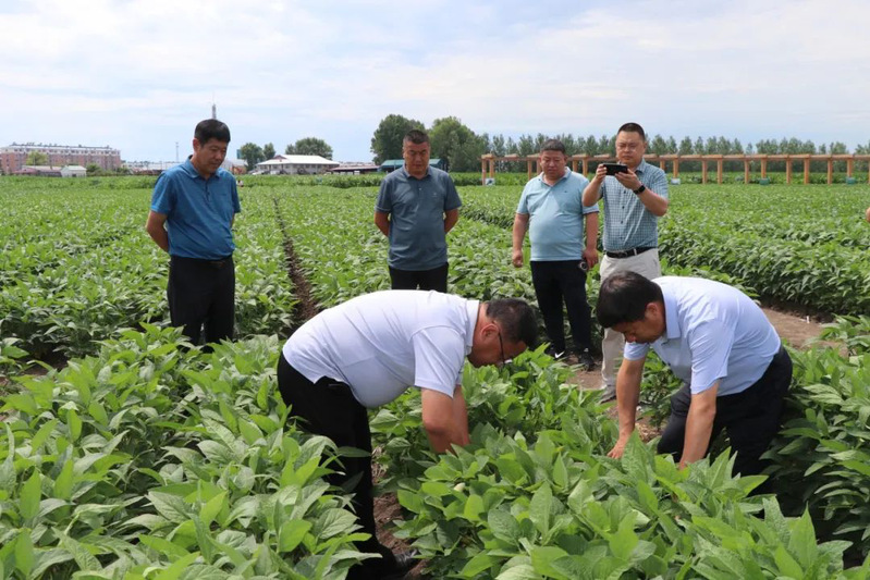 7月9日,作物种质资源创新团队负责人杜吉到带队到黑龙江省鸡西市八五五农场,就双方合作项目开展调研指导工作。在农场科技园区,团队深入田间地头,重点查看了大豆示范品种的生长态势,细致检查植株是否存在杂株、病虫害等问题。针对现场发现的情况,团队结合种植实际,现场分析成因并提出了针对性的解决方案,为大豆作物健康生长提供有力技术支撑。