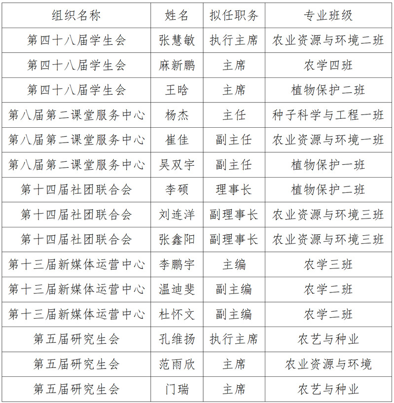 为加强各学生组织骨干选拔任用工作的民主监督,现将拟任用人选名单公向全院进行公示,公示期自2025年10月15日至2025年10月17日,对上述人员如有异议,请在公示期内向学院团委反映,反映问题必须实事求是,应签署或告知真实姓名,对匿名举报不予受理。