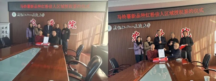 马铃薯种质资源创新与新品种选育团队负责人金光辉分别与新疆喀什远届淀粉有限公司、承德永丰种业集团有限公司签约和种苗交接,并为两家公司颁发了区域生产授权证书。
