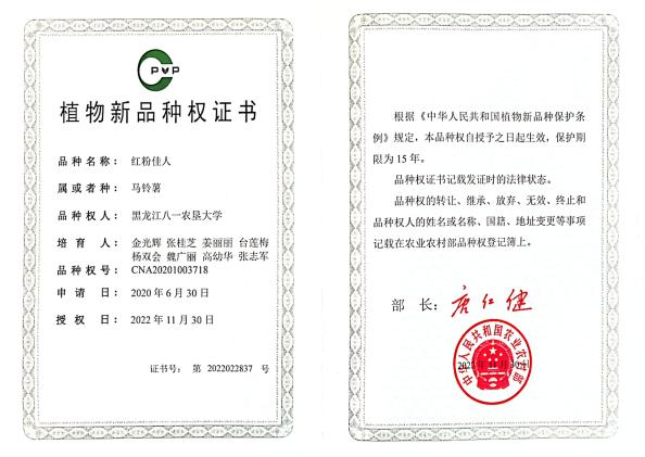 马铃薯品种“红粉佳人”是我校2022年育成的鲜食、淀粉加工兼用型品种,当年获批国家农业农村部非主要农作物品种登记证书及植物新品种权证书,因其具有高淀粉含量、高干物质、营养丰富,口感软糯香面等优点,一经推广,深受祖国南北种植户和薯业青睐,2024年对河北张家口、承德,内蒙古赤峰、呼伦贝尔、乌兰察布进行了区域授权,2025年春对辽宁丹东、本溪、鞍山进行了区域授权。