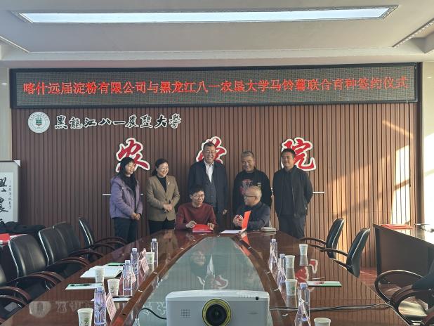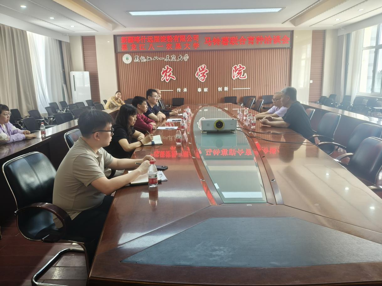 签约会上新疆喀什远届淀粉有限公司领导介绍了公司概况以及当地淀粉加工原料薯生产现状和种植技术水平,总结了引种我校马铃薯品种在适应性、产量、抗性的田间和产量优异表现以及在淀粉含量及提取加工的突出表现,给予了高度评价,产量均在5吨以上,淀粉含量较当地品种高5个百分点以上,普通加工品种生产线每加工1小时产出3-4吨淀粉,而采用垦薯1号可产出7-8吨淀粉,为企业大幅度降低成本提高了利润。同时结合企业充足的办公、土地、科研条件及自身长远发展规划和实际需求,提出与我校开展校企合作建立科研基地、联合育种、技术与人才引进等方面的迫切期望。