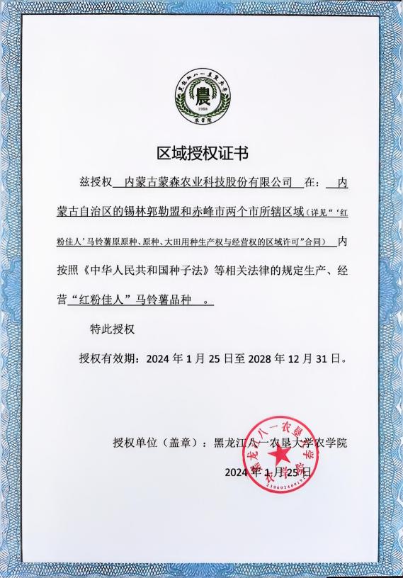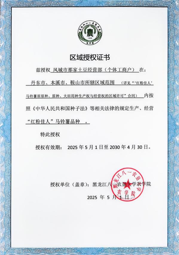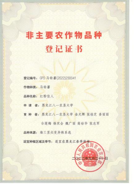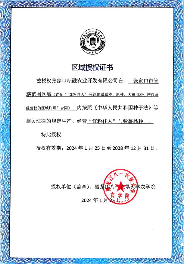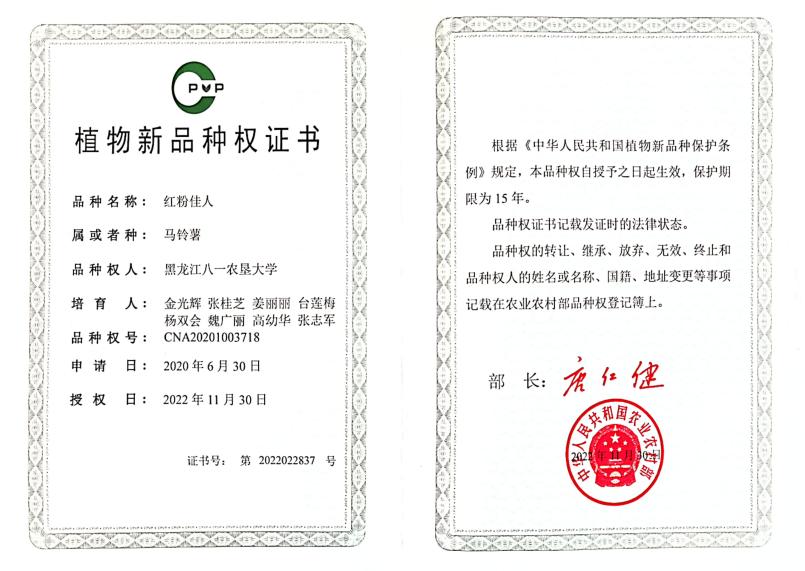 我校2022年育成的鲜食、淀粉加工兼用型马铃薯品种“红粉佳人”,获批国家农业农村部非主要农作物品种登记证书和植物新品种权证书后,因其具有高淀粉含量、高干物质、营养丰富,口感软糯香面等优点,一经推广,深受祖国大江南北马铃薯种植户和薯业青睐,自2024年先后对张家口耘融农业开发有限公司、围场满族蒙古族自治县薯丰种业有限公司、内蒙古蒙森农业科技股份有限公司、呼伦贝尔宏杉薯业有限公司、察右中旗得丰种植专业合作社、凤城市那家土豆经营部六家公司(合作社)进行了区域授权。