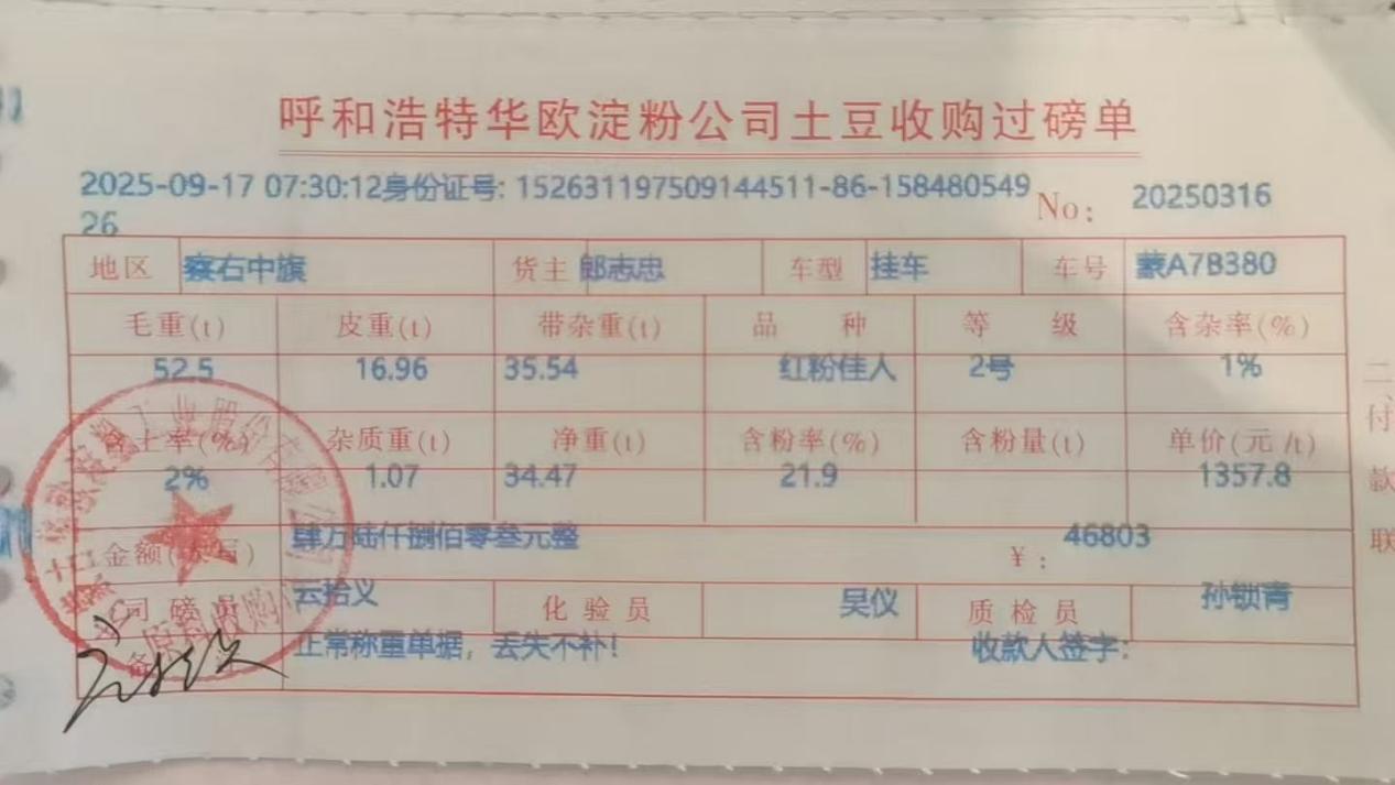 今年秋收之季,在内蒙古呼和浩特表现的表现优为突出,察右中旗种植的“红粉佳人”实收淀粉含量达21.7%和21.9%,每吨销售价格分别为1345.4元、1357.8元,利润远超普通淀粉加工品种。