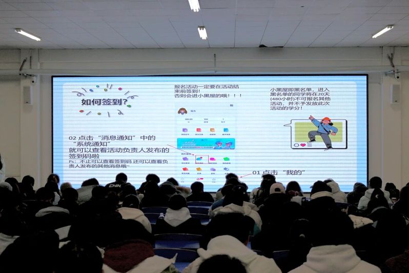 宣讲环节,田羽琦学姐围绕“到梦空间”APP使用与“第二课堂成绩单”制度两大核心内容展开讲解。在APP操作指导部分,详细演示了活动发布的全流程,包括活动基本信息填写、报名设置、学分与奖项配置等关键步骤,同时针对新生关心的活动报名、签到流程、学分查询等问题,结合实例进行分步教学,重点强调了签到纪律,提醒新生错过签到将进入黑名单,影响学分获取与后续活动报名。