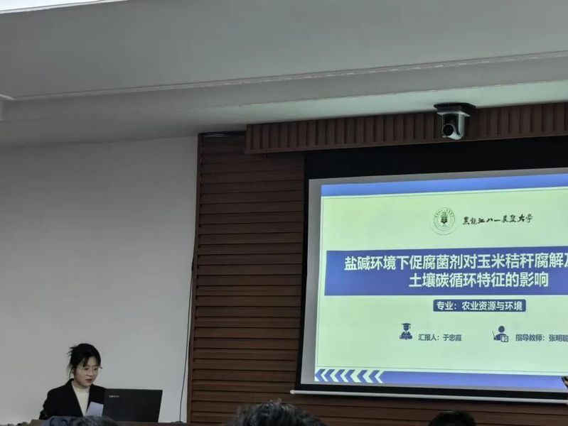 于忠霞报告题目为《盐碱环境下促腐菌剂对玉米秸秆腐解及大豆田土壤碳循环特征的影响》为题,系统研究了秸秆还田配施促腐菌剂对秸秆腐解过程、有机碳组分、微生物特性等土壤碳循环关键环节及温室气体排放的综合影响。通过分析秸秆腐解速率、碳氮比、养分释放率以及土壤团聚体、有机碳和微生物群落的动态变化,揭示了其内在的碳循环机制。研究成果对于开发精准、高效、低碳的秸秆还田技术具有重要指导意义,同时也为土壤生态系统管理修复及国家农业绿色发展与“双碳”战略的实施提供了科学参考。