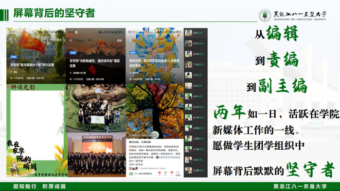 屏幕背后的坚守者:作为3044am永利集团欢迎您新媒体工作室副主编,愿做学生团学组织中默默的坚守者,从编辑到责编再到副主编,两年来参与公众号制作150余次,独立策划原创推文12条,用镜头与文字讲述农学故事。