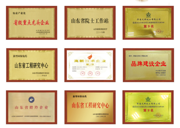 获评国家高新技术企业、农业产业化省级重点龙头企业,跻身中国农药行业销售百强、山东省瞪羚企业行列,产品质量管理体系达到国际标准。
